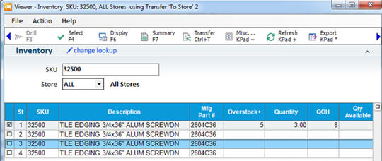 In the Store field, enter the store number of the store needing the item, and press Viewer (F9). The Inventory Viewer displays, with the Transfer "To" store included in the Title bar.