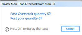 If you enter a quantity that is greater than the available overstock quantity, a dialog asks you whether you want to post only the overstock amount, or the quantity you entered.