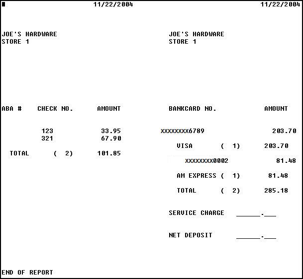 Totals— A total dollar amount prints for checks and in parentheses is the total number of checks. For each bankcard type, a total dollar amount prints, along with a total for all bankcards. In parentheses is the total number of bankcards for each type and the grand total amount.