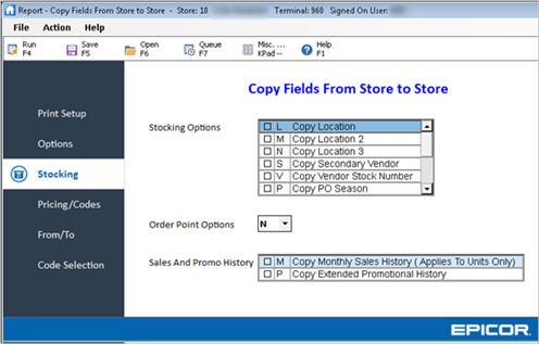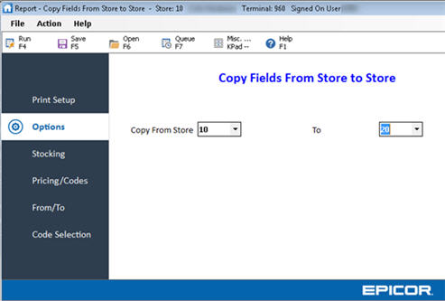 Note: Selecting or deselecting some of these fields can have some unexpected results. For example, if you copy over the code for Lot Items, but do not define any lots for the new store. Also, selecting Store Closeout, but having chosen not to copy these on the Options tab will cause you to not have any records flagged this way. Tax code could also present you with challenges if you are using line item tax codes by store.