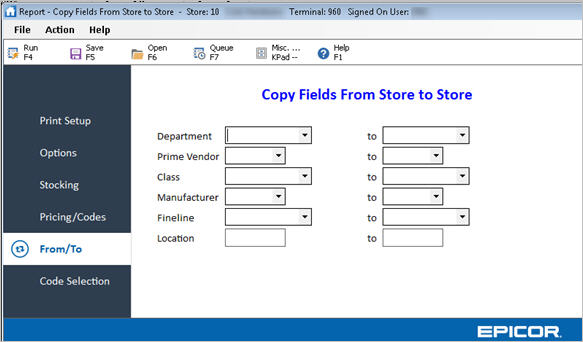 In the To field, select the store to which you will copy records. Or, you can select ALL to copy supporting files (not inventory records) from the From store to all other stores.