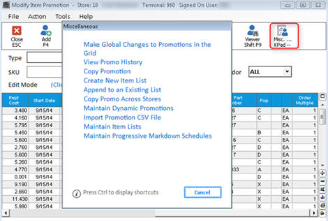 From the Misc Menu of Modify Item Promotion (MIP), you can create an part list for the items currently displayed in the grid. You can then use that part list to dictate the items to include in a particular process or report.