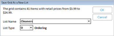 In the dialog that displays, if you are creating a new list, enter a List name (maximum of 32 characters) and select a List Type. If you are appending SKUs to an existing list, select the List Name to which you are appending from the drop-down list.