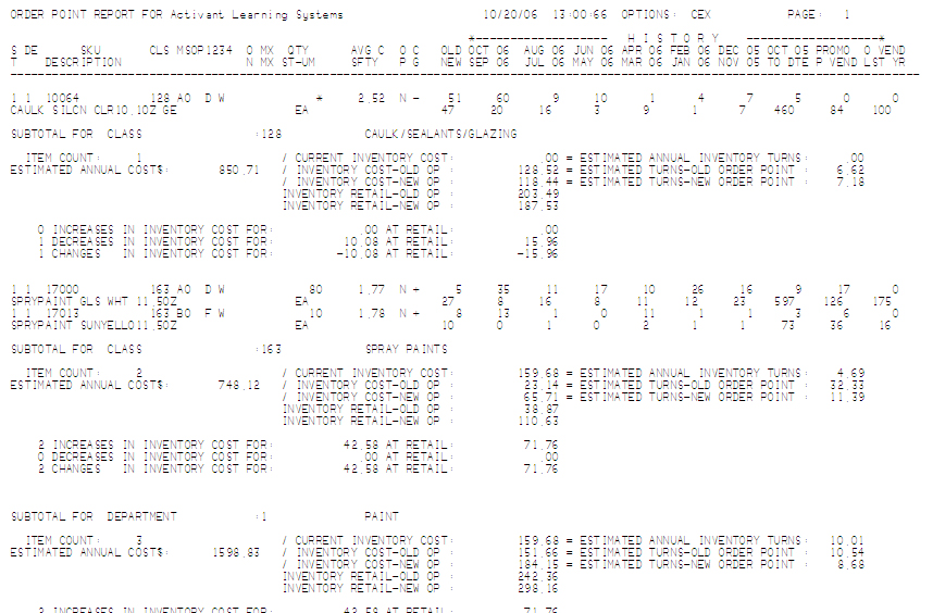 This topic provides an example of the Order Point report (ROP) and definitions of the fields on the report. For more information about ROP and procedure steps for running the report, click here to go to the online help topic. This report is available from both the Eagle Browser and Network Access.