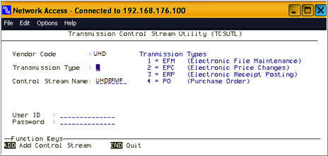 Important: All control streams must begin with the letters indicated ("UHDEFM,”"UHDPC," "UHDERP," "UHDPO,” etc.). You can optionally add a suffix (e.g., to indicate the store number), but you must use the required letters. For example, the control stream name “UHDEFM2” is acceptable because it contains the required letters “UHDEFM.” However, the name “HEFM2” is not acceptable because it does not contain all the required letters “UHDEFM.” The TCSUTL screen enforces the rules of the required letters.