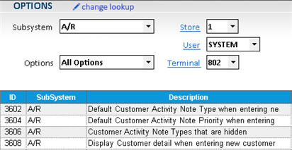 - Click Change Lookup. At Subsystem, select A/R Accounts Receivable. At Options, select All Options. Press Enter. All available A/R options display in the grid. The following are the Customer Notes options.