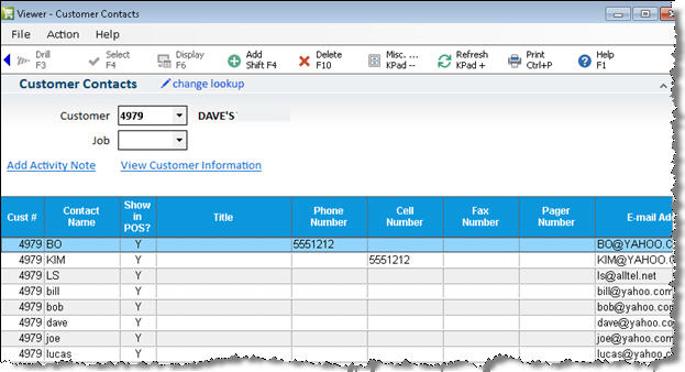 If you already had a customer displayed when you accessed the Viewer, that customer's contacts display automatically. Otherwise, select a customer in the Customer field (and a job in the Job field, if applicable), and press Enter.