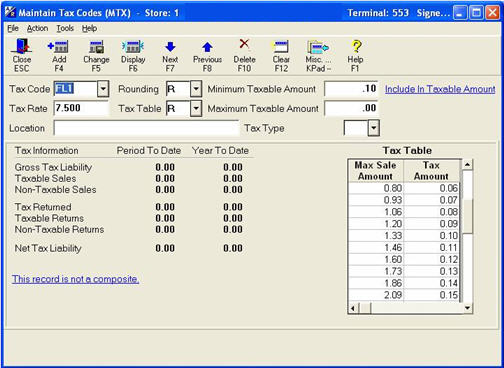 For example: The first line of the Max Sale Amount is .15, and the Tax Amount is .01. This means that on sales up to $.15, the system assesses a $.01 sales tax.