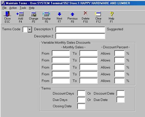 For example, you give a 5% terms discount to customers whose monthly sales volume is between $100 and $500. On the first level (line), enter 100 in the From field, 500 in the To field, and 5 in the Allows field.