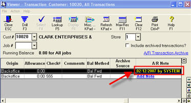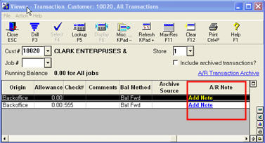 You can attach A/R Notes to Accounts Receivable transactions from any of the following windows: Open Item Maintenance (MOI), Received on Account (ROA), the A/R Transaction Viewer, or the A/R Archived Transactions Viewer. You can use A/R Notes to record information about specific transactions in order to help you manage your A/R accounts. To add a note, you simply click the Add Note hyperlink and type your note. As a result, the hyperlink no longer says "Add Note," but instead displays the date of the note and the user who entered it. This means that you can tell at a glance that a transaction has a note, when it was written, and who wrote it.