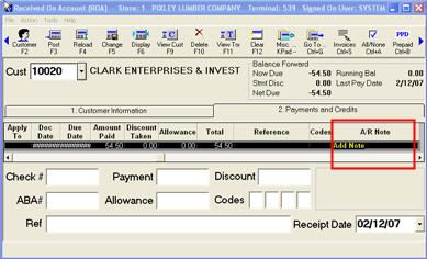 If you are adding a note in Received on Account, click the Add Note hyperlink in the A/R Note column, which is located in the grid on the Open Invoices tab, Payments and Credits tab, and Unapplied Documents tab (note: you may need scroll to the right to see the A/R Note column).