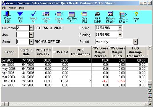 In the top section of the viewer, select the customer/job/store, select what type of sales summary you want (daily, weekly, monthly, calendar year, calendar quarter, date table period, or date table year), enter a starting and ending date, and press Enter.