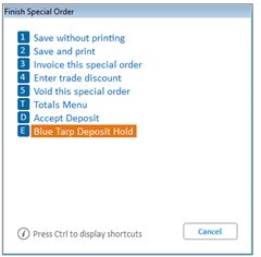 When creating an Order or Special Order, on the Finish Order or Finish Special Order menu use choice E “BlueTarp Deposit Hold” to reserve funds against the customer’s BlueTarp Open to Buy.