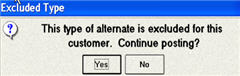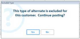 If the customer is set up to exclude certain alternate item types, those types are excluded from the list that displays, unless you set the option " Allow Selling Customer Excluded Alternate Items at POS?" to Yes, in which case the excluded types do display, but the clerk receives a warning if they select an excluded alternate.