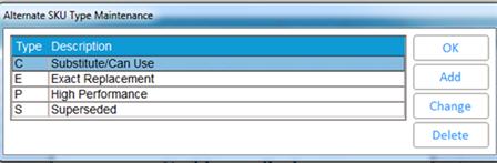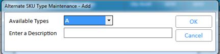 Click Misc, and select Alternate SKU Maintenance Viewer. From the viewer, click Misc and select Maintain Alternate Item Types. The Alternate SKU Type Maintenance dialog displays.