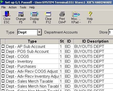 If you pass off to General Ledger by department, create G/L accounts for Buyout Purchases, COGS, Sales, and any other accounts that are pertinent to your business, and enter those accounts in the Setup GL Passoff window under the Buyout department.