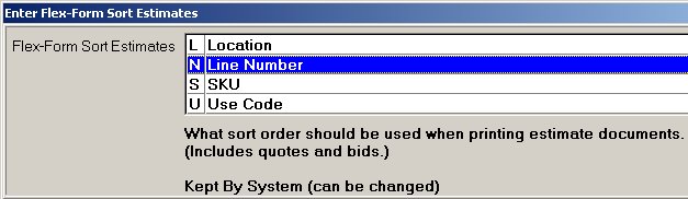 Notice that for each form type (estimate, order, etc.) there are three options— form type, sort order, and location/suggested column ("loading ticket" only has the first option: form type)— plus there is one additional option as to whether or not a barcode prints. For each of the form types, you will set these three options (only one option for "loading ticket"), plus the "barcode prints" option, if desired.