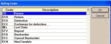 Instead of typing the Selling Code in the Quantity field, you can display a list of Selling Codes from which you can select one. To do this, enter an H (Help) in the Quantity field and press Enter. A dialog box displays. Click the checkbox next to the desired Selling Code, and press Enter. Then enter the quantity being sold/returned, and press Enter.