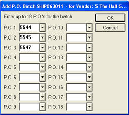 In the next dialog, select up to 18 POs for the batch. Note that you can use the drop-downs to select POs, or you can enter them manually. When finished selecting POs, click OK. If you are ready to close PO Batch Maintenance, click Cancel.