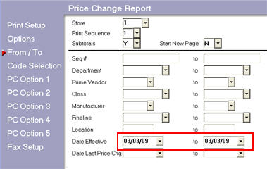 On the From/To page, enter the date the price changes were generated in the Date Effective field (enter the date in both the From and To fields).