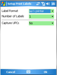 On the Setup Print Labels screen that displays, change any of the settings by clicking the down-arrow and making your selection.