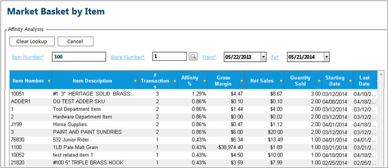 - The Market Basket analytic displays for the item. You can click any of the hyperlinks (Item Number, Store Number, etc.) to change the lookup information. You can also click Clear Lookup to clear the lookup fields at the top so that you can enter new lookup criteria.