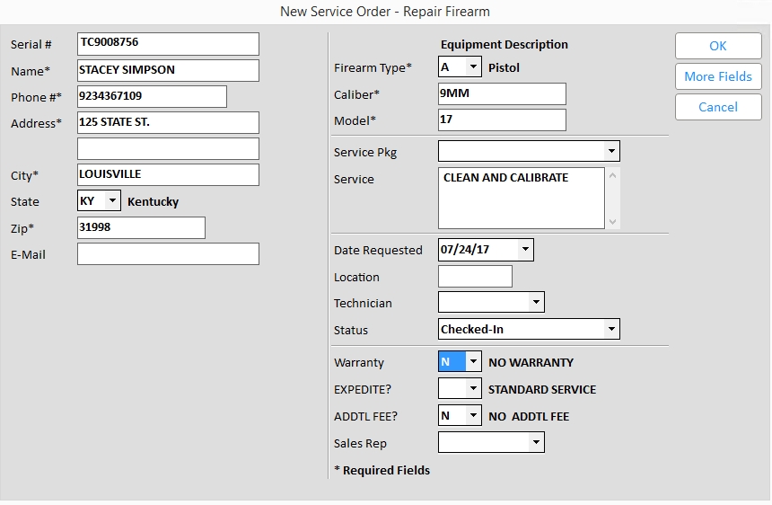 There is a one to one relationship for firearm repairs and Service Orders. If a customer has multiple firearms to repair, a unique Service Order is required for each firearm. This functionality is required for proper tracking by the firearm’s Serial #.