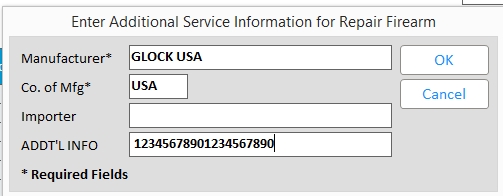 In the next dialog enter the required Manufacturer and County of Manufacture. Also in the optional fields enter Importer and FFL License #, and press Enter.