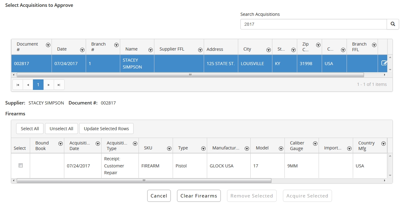 Order with Status set to Checked-In adds the firearm repair acquisition. Once the acquisition has been