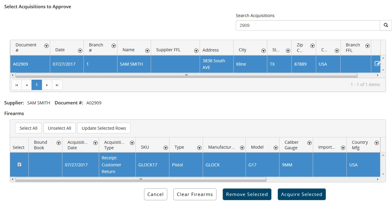 The return of a firearm sends an acquisition to FFLCM for the acquisitions manager to approve and enter the firearm into the bound book. The acquisition type will be "Receipt: Customer Return". If more than one firearm is being returned, each item must be posted as an individual line on the POS transaction to provide proper recording of the firearm’s serial number. The serial number is required and will be passed in the acquisition sent to FFLCM.