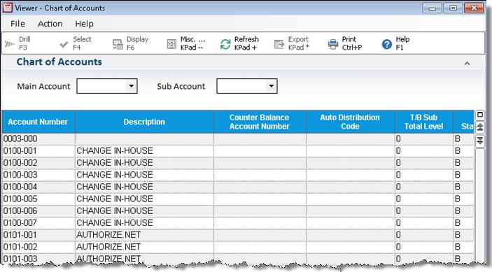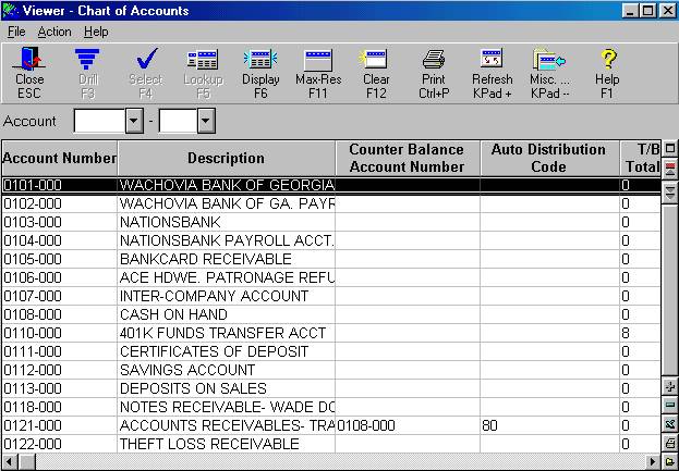 Click Viewer. The Chart of Accounts Viewer displays, showing all your accounts listed by account number.
