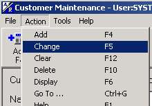 The Action menu is one of the selections available. From the Action menu you can select the action you want to perform. For example, you are working in the Customer Maintenance window and want to save your work. From the Action menu, you would select Change.