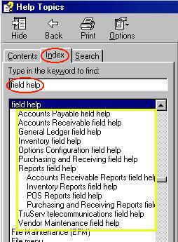 From the list that displays, double-click on the field help you want. For example, click "Accounts Receivable field help" if you are looking for field help for an Accounts Receivable window.