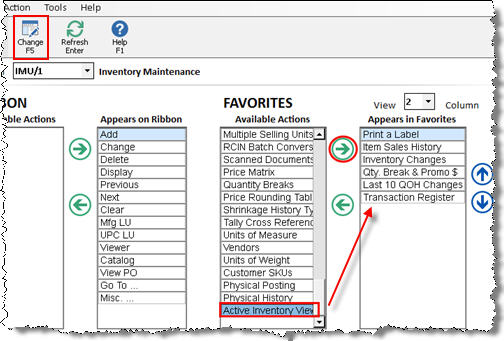 - Under Favorites, in the Available Actions box, scroll down and click Active Inventory Viewer, then click the arrow pointing to the right. The entry moves to the “Appears in Favorites” box.
