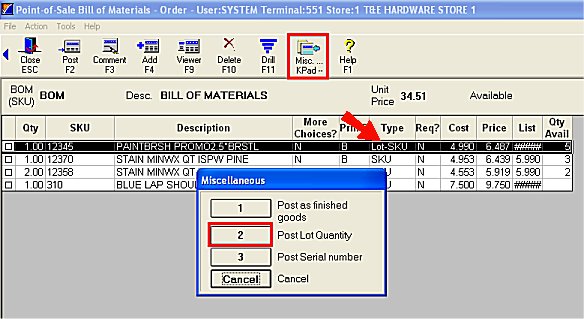 If a component is a lot item, as indicated in the Type column, select the lot by clicking Misc, then clicking Post Lot Quantity.