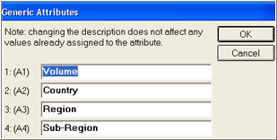 In the dialog that displays, type the descriptions you would like to use for the attributes you set up when you ran GATSETUP. Consider the sequence in which you name the attributes, keeping in mind that only attributes 1-5 are visible in viewers/grids.
