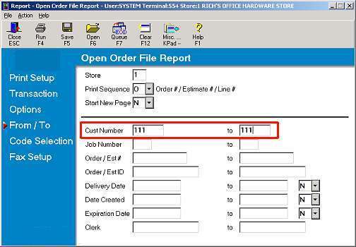 Hint: if you use a particular account number whenever you create a finished goods order, fill in that account number in the From/To Customer Number field on the From/To page of the report. For example, if you use account 111 for all finished goods orders, you'd fill in the screen like this: