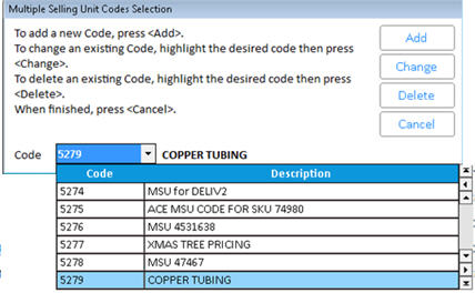 From the Inventory Maintenance window, the Codes tab, click the Multiple Selling Unit Code hyperlink. The Multiple Selling Unit Codes Selection dialog displays.