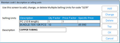 To modify a selling unit, click on it, click change, make your modifications in the dialog that displays, and click OK. Then click Cancel twice to exit.