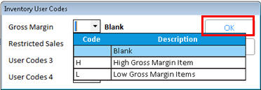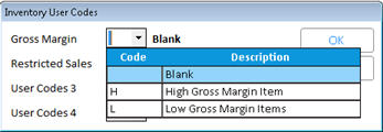 This topic explains how to work with user codes that you have set up as pre-defined choices. Once you have finished setting up user codes, you can assign codes to items in Inventory Maintenance, or you can simply view codes' current values. Note that you can also use Item Code Update (RICU) to assign user codes to items. This procedure shows how to assign codes in Inventory Maintenance.
