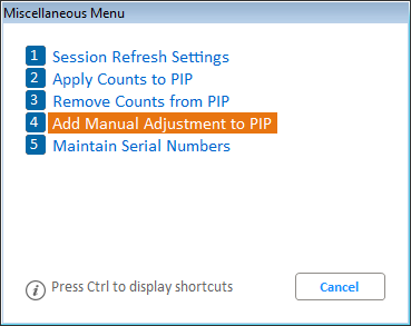 If option 3074 is Yes and 8990 is Yes (for multi-store users), adding an item with the Tally=S (Serialized item) into the Add dialog will add the SKU into PIP ignoring any count entered. After all SKUs have been added, press Cancel to close the dialog. The notification message will display to inform you of how many serialized items were added to PIP and to use the Serial Number Viewer (SNV) to enter counts.