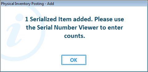 <OK> will add the serialized item to Physical Inventory Posting