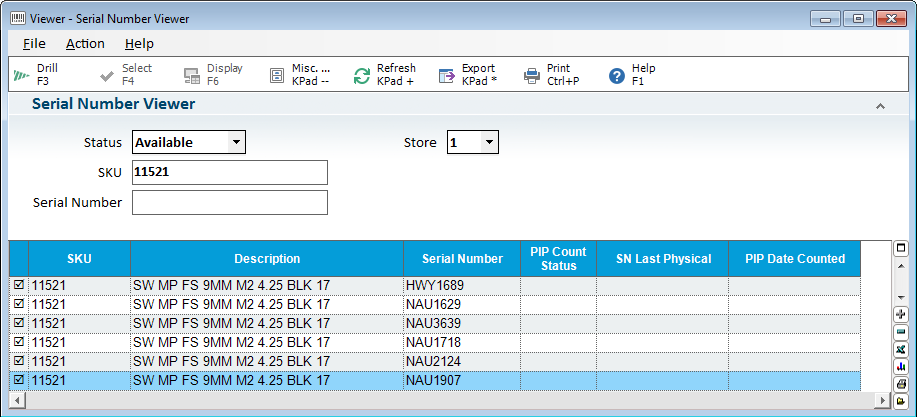 In the Serial Number Viewer (SNV) use the lookup criteria to make any additional changes to lookup serial numbers to count. You can lookup by Status=Available and SKU, making sure you have the correct store set for counting and posting back to PIP. Select the serial numbers that you want to add a count post to PIP.
