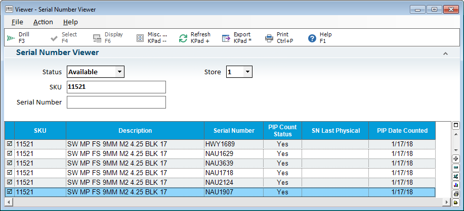 Display the Serial Number Viewer (SNV) - From PIP with the serialized item loaded select the item to count in the grid. In the Serial # column, click on the Yes hyperlink to open the Serial Number Viewer. Any serial numbers for that SKU that are available display.