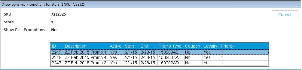 A list will display showing current and upcoming Dynamic Promotions where the SKU is either a qualifier and/or a recipient.