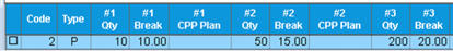 - Fill in your quantity break pricing values to the right of a quantity break code (available codes are 2-999). For example, to set up a quantity break where you give a 10% discount if a customer buys 10, a 15% discount if they buy 50, and a 20% discount if they buy 200, set up the quantity break like this: