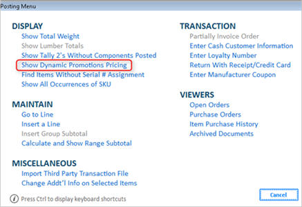 If you want to check the Dynamic Promotion pricing that will be applied but you’re not ready to total the transaction, open the Posting Menu. Then select A – Show Dynamic Promotions Pricing.