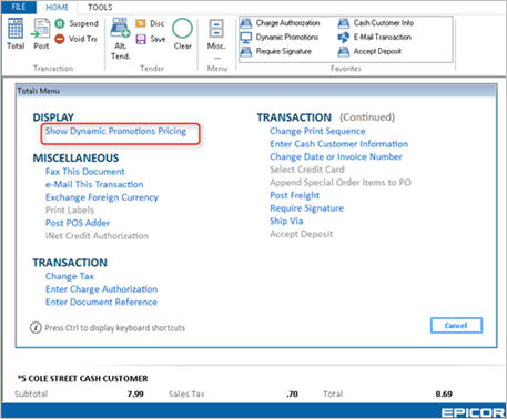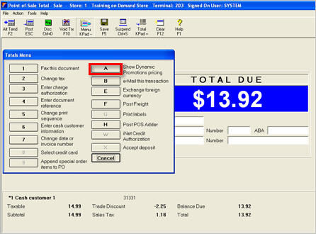 - If you are on the POS Totals screen and want to view the Dynamic Promotion pricing that will be applied, click Menu, and select A – Show Dynamic Promotions Pricing.