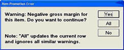 If you receive a warning message about "negative gross margin" or "promo price is greater than retail price," you can select Yes to bypass the warning, or you can select All so that additional instances of that warning within this "global change" session will not display.