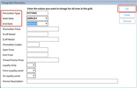 In the Change Item Promotions dialog box that displays, enter the Promotion Type, Start Date, and End Date.